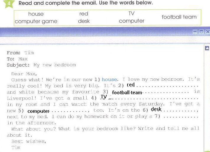Hi, my name’s Lucas and this is my room. My bed is red and white – my football team’s colours! My trains and CDs are in my bookcase, That’s my new TV on my desk. My room is cool.
