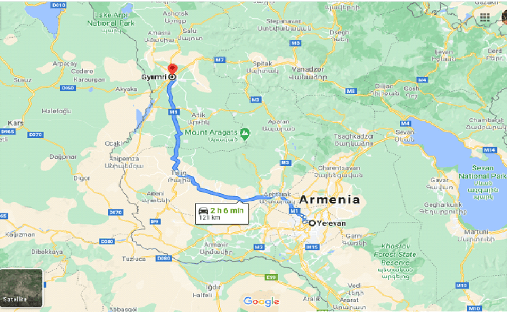 1․ Երևանից Գյումրի 121 կմ է: Մեքենայով Երևանից Գյումրի կարելի է հասնել 2 ժամ 6 րոպեում: Ճանապարհը անցնում է Արագոծոտնի և Շիրակի մարզերով: