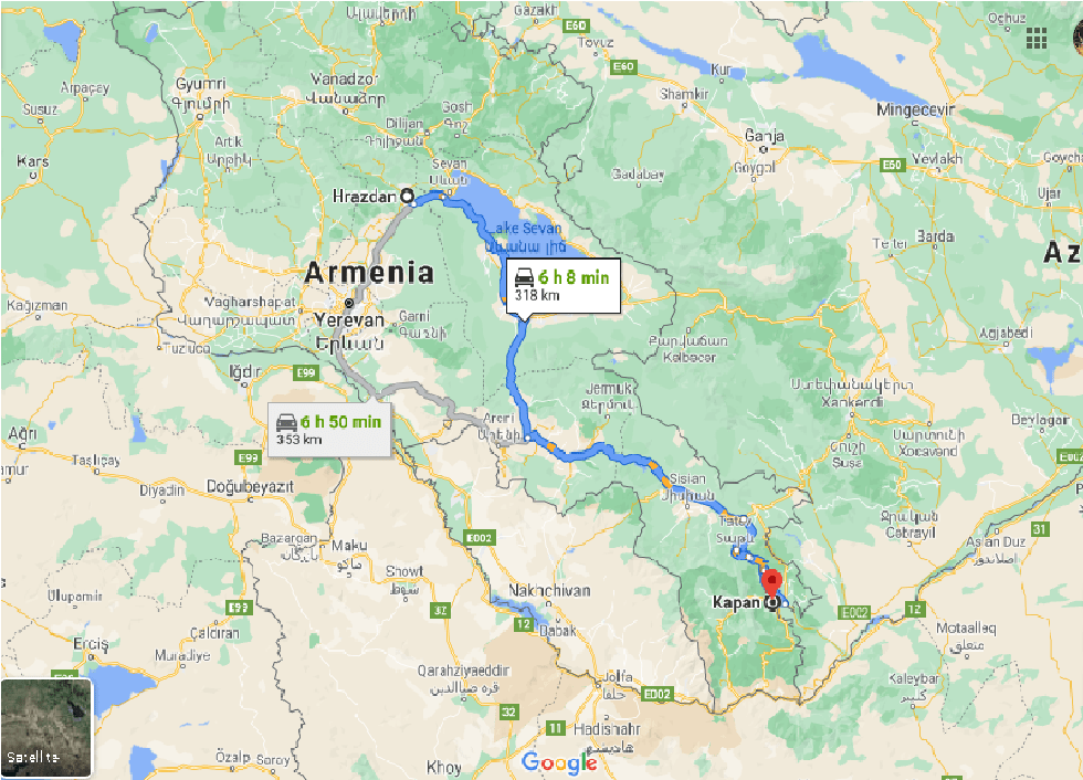 2. Հրազդանից Կապան 318 կմ է: Մեքենայով Հրազդանից Կապան կարելի է հասնել 6 ժամ 8 րոպեում: Ճանապարհը անցնում է Գեղարքունիքի, Վայոց Ձորի և Սյունիքի մարզերով: