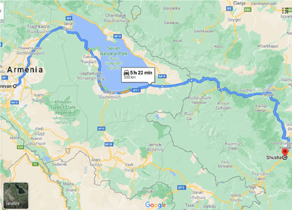 3. Երևանից Շուշի 330 կմ է: Մեքենայով Երևանից Շուշի կարելի է հասնել 5ժամ 22 րոպեում: Ճանապարհը անցնում է Հայաստանի Կոտայքի և Գեղարքունիքի մարզերով, ինչպես նաև Արցախի Հանրապետությունով: