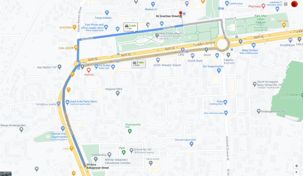 4․ Մեր բնակարանից մինչև իմ դպրոց 1.1 կմ է: Մեքենայով դպրոց հասնելը տևում է 2 րոպե: Ճանապարհը անցնում է Սվաճյան և Բաբաջանյան փողոցներով: