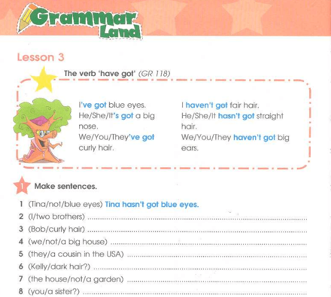 (Tina/not/blue eyes) Tina hasn`t got blue eyes.