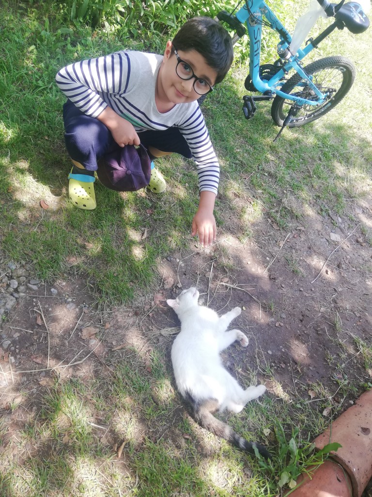 This is me in the village. In this photo I am playing with my lovely cat!!!