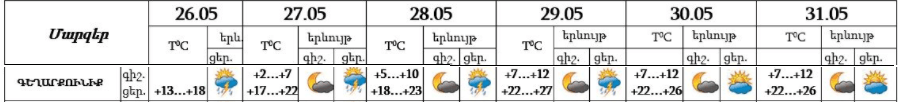 Պարզվեց, որ մեր ճամփորդության օրը՝ մայիսի 28-ին, եղանակը ցեկերը լինելու է +18-ից մինչև +23C, բայց եղանակը անձրևային է լինելու, նաև ամպրոպ է սպասվում: