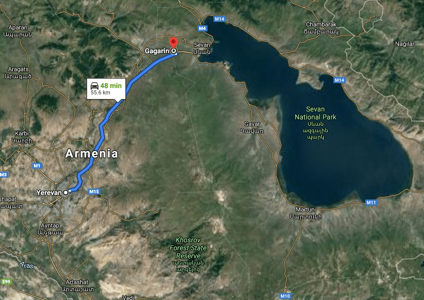 Սա Երևանից դեպի Գեղարքունիկի մարզի գյուղ Գագարին մեր ճամփորդության քարտեզն է: Քարտեզից երևում է, որ հեռավորությունը 55կմ 600մ է և մեքենայով ճանապարհը կտևի 48 րոպե: